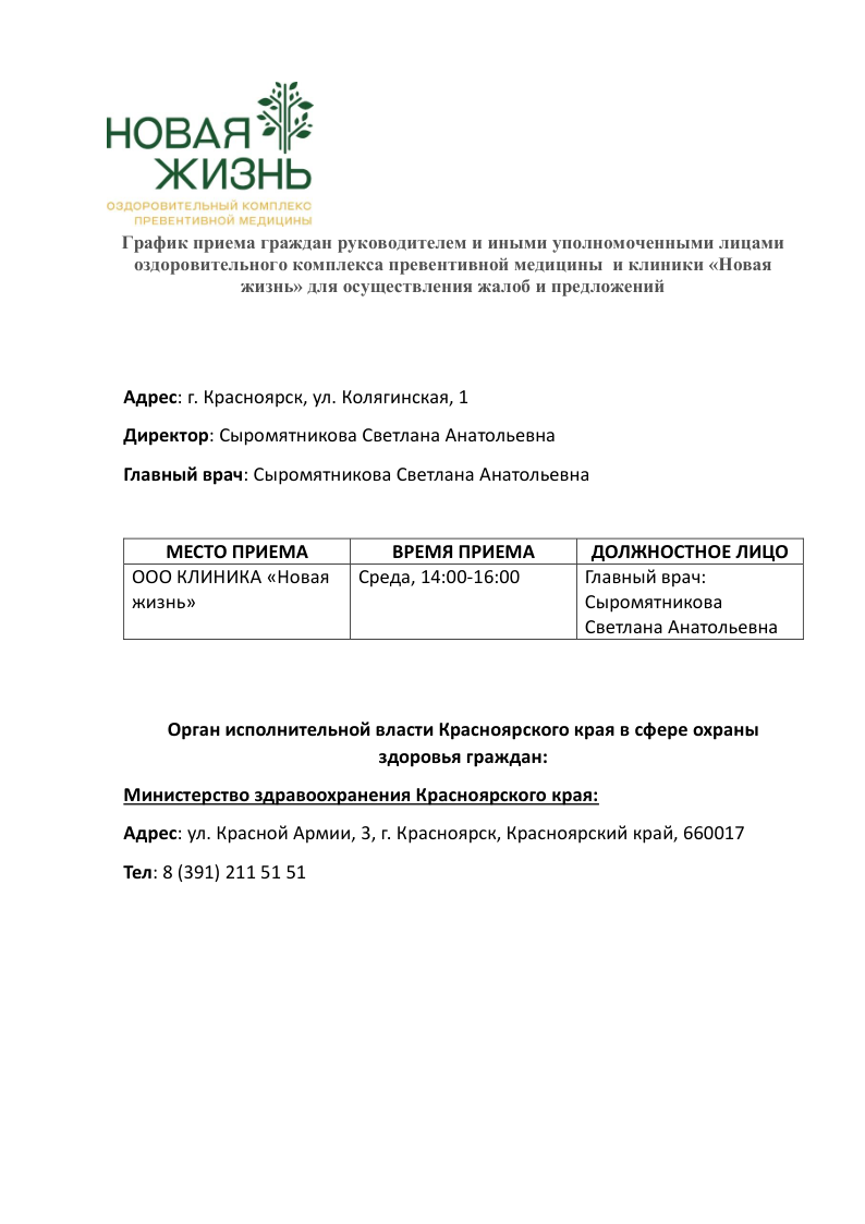 График приема граждан руководителем и иными уполномоченными лицами Новая жизнь