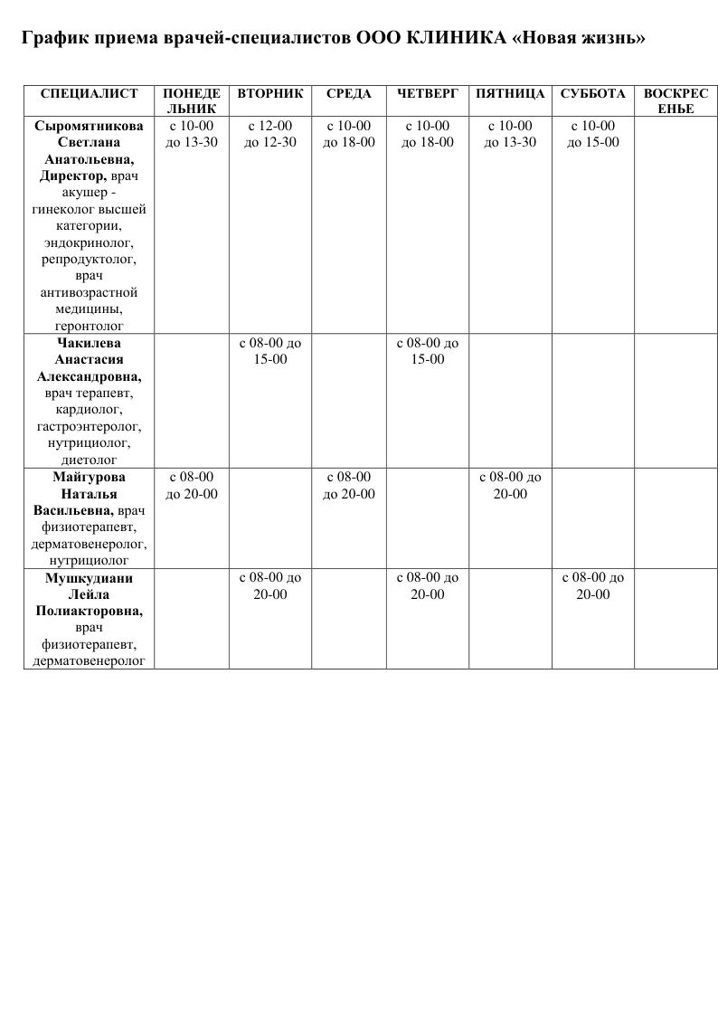 График приема врачей-специалистов Новая жизнь