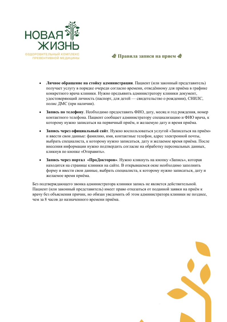 Правила записи на прием в клинику Новая Жизнь